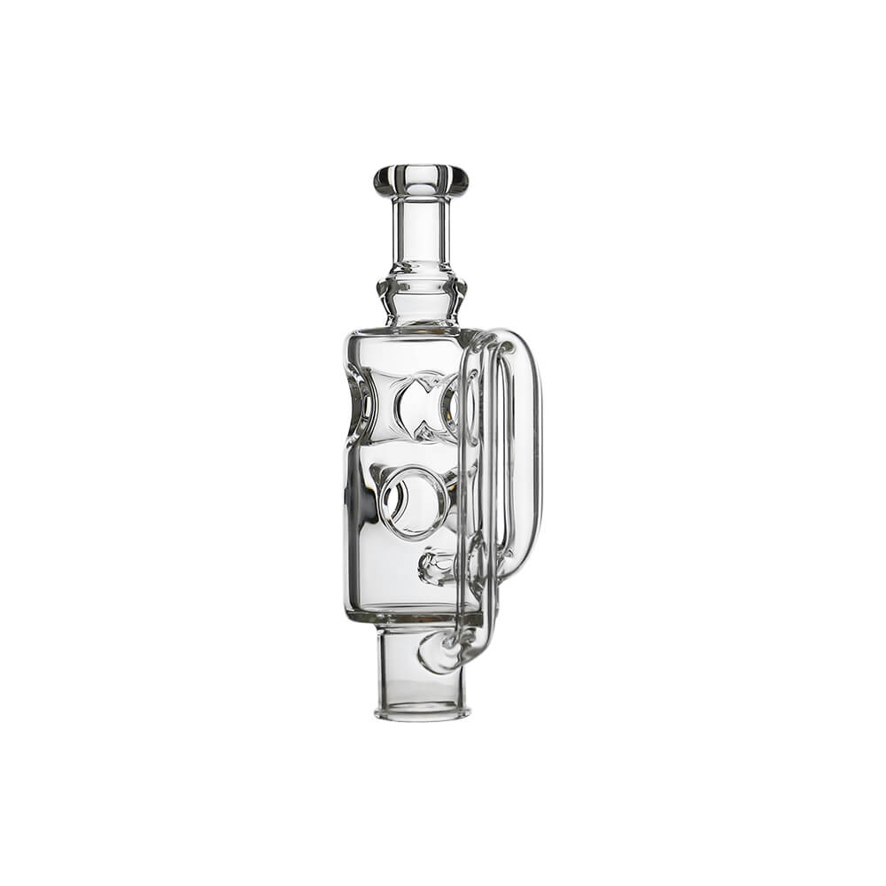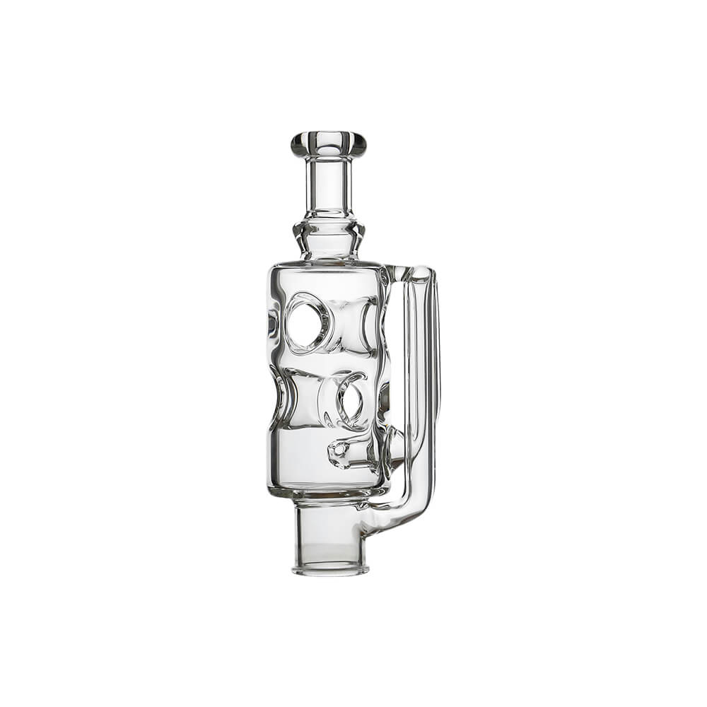 The Ghost²™ Straight fab Glass Top features a multi-tiered circulation system with a sculpted airflow chamber that delivers a smooth and stable performance. Its clean, futuristic silhouette is complemented by precision-engineered internal pathways that create a cyclonic flow effect. The extended side handle enhances control and balance, while the clear glass body showcases the dynamic movement inside. A perfect blend of visual engineering and high-performance functionality.
